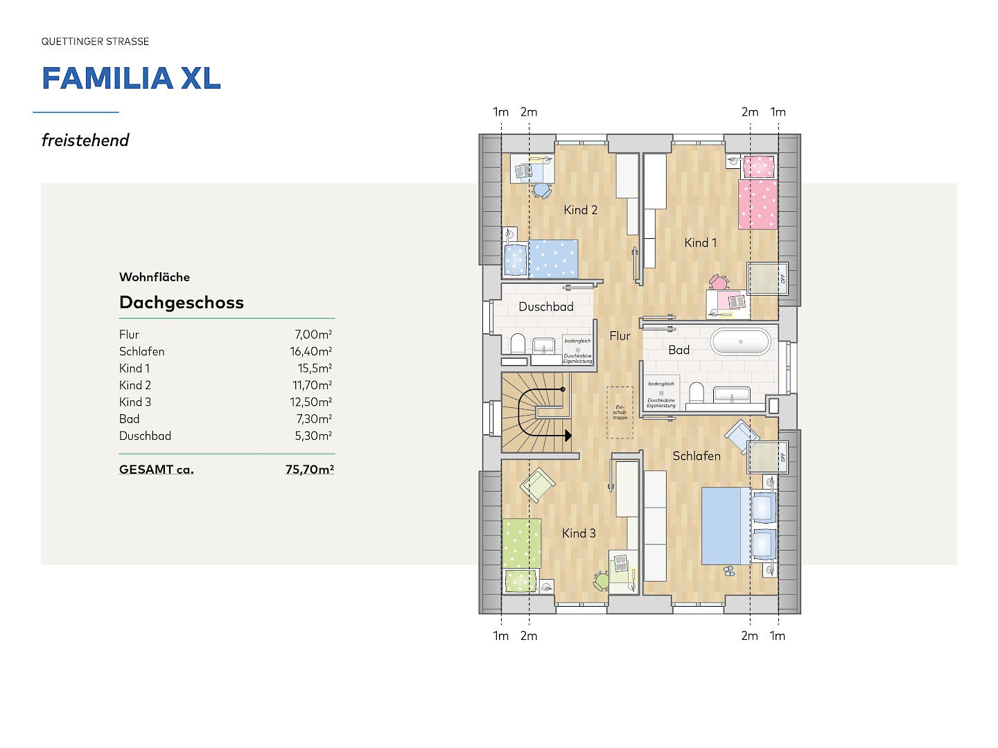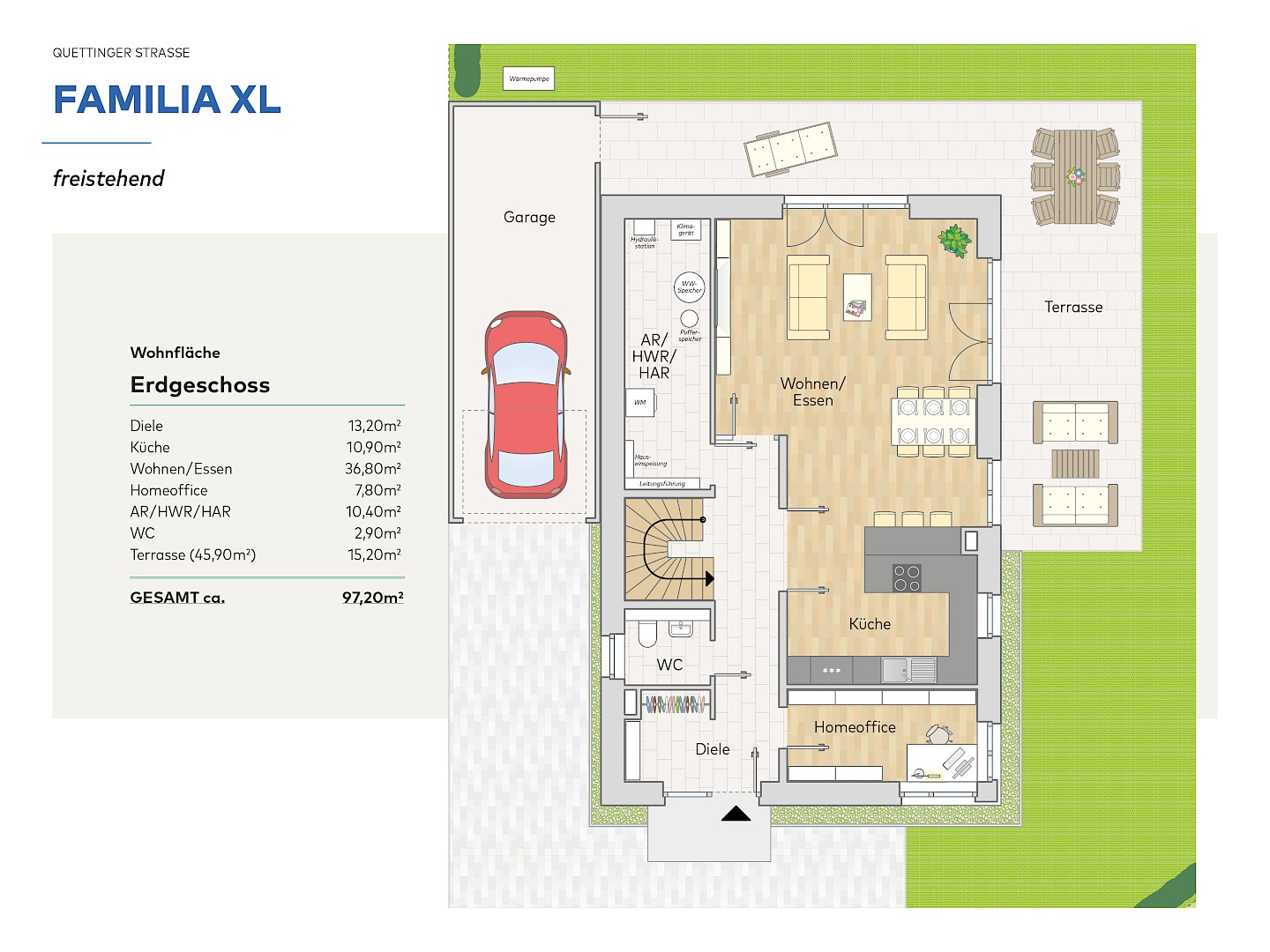 FAMILIA XL ist in Sachen Raumaufteilung die XL-Variante unseres beliebten Haustyps FAMILIA. Die zusätzliche Fläche kommt in erster Linie den Wohn- und Schlafräumen zugute – ganz im Sinne der Familie. Besonders im großzügigen Wohn- und Essbereich, der weit mehr als die Hälfte des Erdgeschosses ausmacht, kann Familienleben stattfinden. Etwas kleiner fällt hingegen das Homeoffice aus. Sie hätten es gerne größer? – Sprechen Sie uns an!